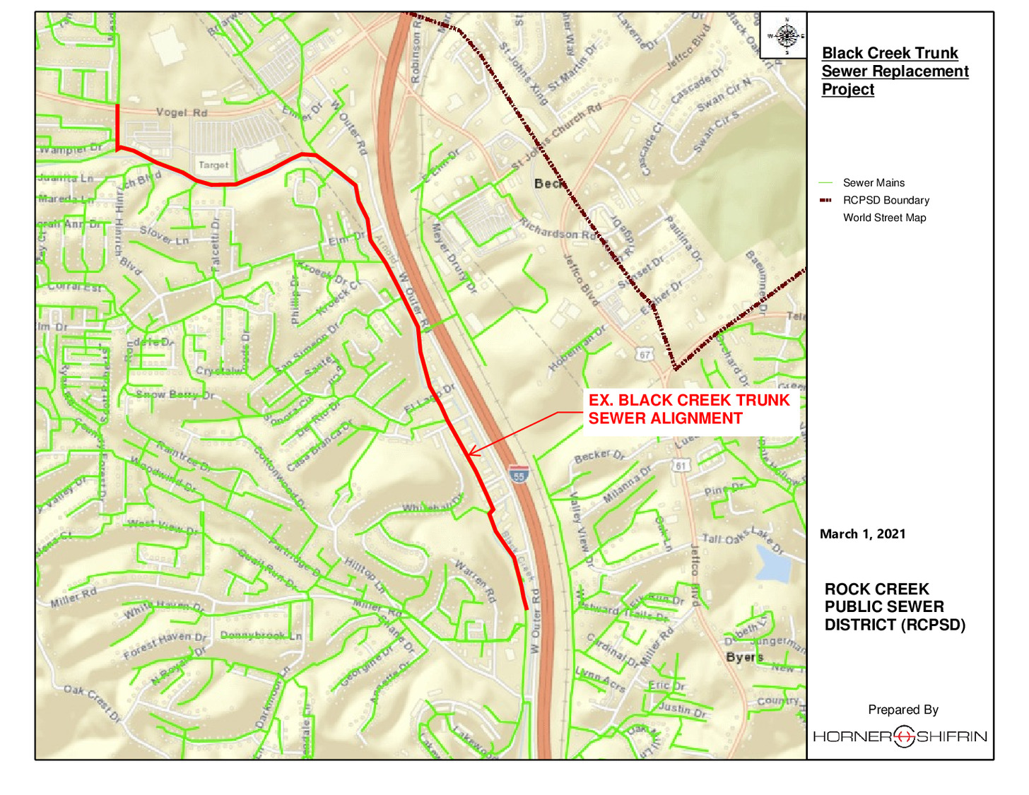 Horner & Shifrin provided engineering service for design, bidding and construction phase services for the replacement of approximately 9,700 feet of the existing Black Creek Trunk Sewer from Vogel Road to Miller Road with 12″ through 24″ diameter sewer pipe. Construction contract documents will be developed utilizing the Districts Standard Construction Specifications for sanitary sewer installation. A topographic and boundary survey will be conducted to confirm the exact location of the existing sewers, establish property/easement lines, and develop new and temporary construction easements. Geotechnical investigation was performed by Shannon & Wilson, Inc., as a subconsultant to H&S, to determine existing soil conditions, depth to rock and provide recommendations for special sewer trench excavation/backfill conditions, including 3 creek crossings, 2 road bores, and open-cut excavation adjacent to the bottom of a 300-foot long by 25′ high block retaining wall. Permits will be required from the Missouri Department of Natural Resources and U.S. Army Corps of Engineers for the Section 401 clean water and Section 404 / Nation Wide (No.13 Bank Stabilization). In addition, construction permits will be required form the Missouri Department of Natural Resources, Missouri Department of Transportation, Jefferson County, and City of Arnold.